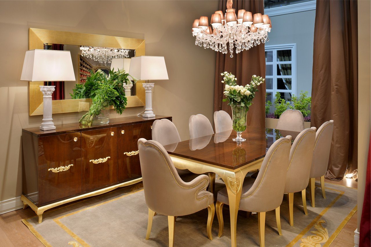 The formal dining room, in ebony and gold, taupe and brown tones, Opera style. The bedroom with a Mediterranean look, a triumph of green, pistachio, sage colors, with hints of gold and pearl. Lamps in shape of pineapple, prints on the walls picturing palm trees, curtains in jacquard with wisteria flowers, extremely elegant. To dream of a summer scented of citrus...